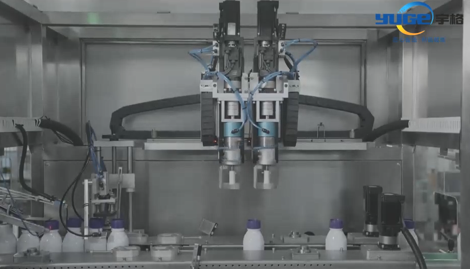 全自動(dòng)雙頭跟蹤式旋蓋機(jī)是參照國際先進(jìn)機(jī)型改進(jìn)設(shè)計(jì)、旋蓋速度快,合格率高、操作方便。 可適用于食品、制藥、日化、農(nóng)藥、化妝品等行業(yè)的不同瓶形的旋蓋。 機(jī)器自動(dòng)化程度高,穩(wěn)定性好,調(diào)節(jié)方便,更換瓶形或蓋時(shí)無須備件,只需作調(diào)整即可完成(如配上蓋機(jī),可進(jìn)行自動(dòng)上蓋)可以根據(jù)實(shí)際需要選配。 品質(zhì)提升:旋蓋時(shí)不停頓,無物料晃出瓶口,不污染瓶身及輸送帶,對鋁箔封口無影響,提升產(chǎn)品品質(zhì)。 節(jié)省人工:跟隨式旋蓋機(jī)不會(huì)晃液,無需人工擦拭瓶身及瓶口。 采用進(jìn)口運(yùn)動(dòng)模塊控制器控制的跟隨旋蓋方式。 采用伺服電機(jī)控制的皮帶分瓶,使得桶的定位更加精準(zhǔn),確保旋蓋合格率高。 無易損件:更換規(guī)格只需更換不同規(guī)格的蓋抓頭,2分鐘即可完成更換。 調(diào)機(jī)快,15分鐘完成規(guī)格切換:常規(guī)旋蓋機(jī)至少需要0.5-1小時(shí)調(diào)整規(guī)格。